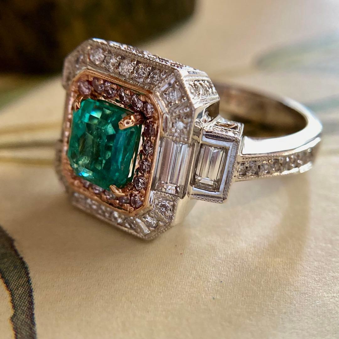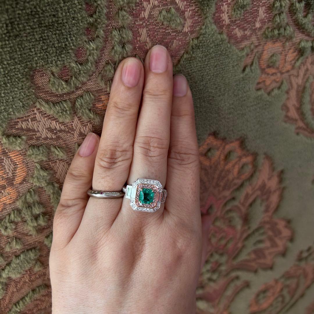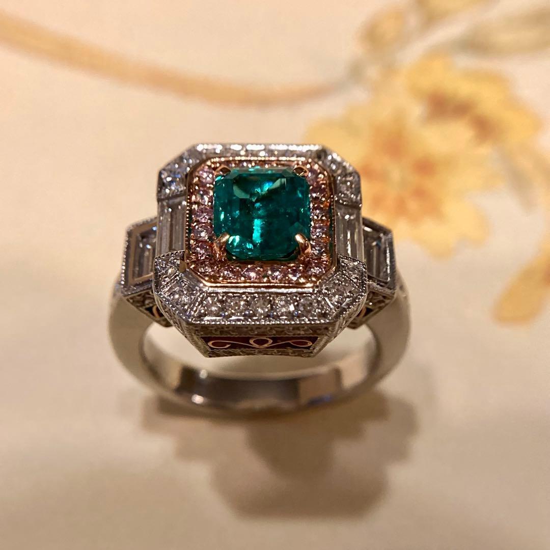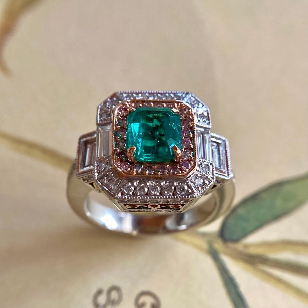 センターのエメラルドに寄り添うのは、可憐なピンクダイヤモンド。その外周をホワイトダイヤモンドが清らかに縁取り、サイドには整然と並ぶバゲットカットダイヤモンドが端正なラインを添えています。