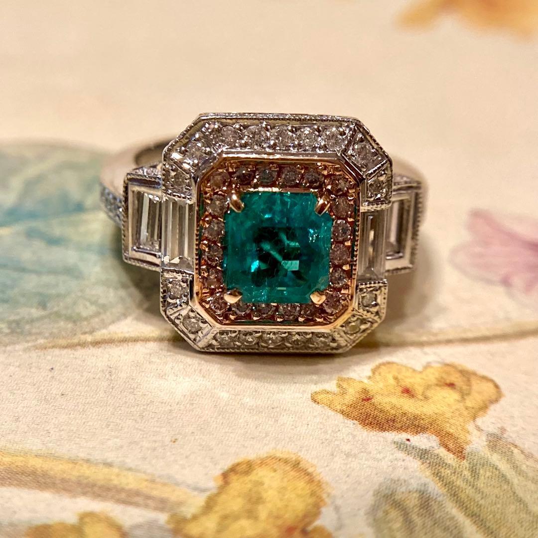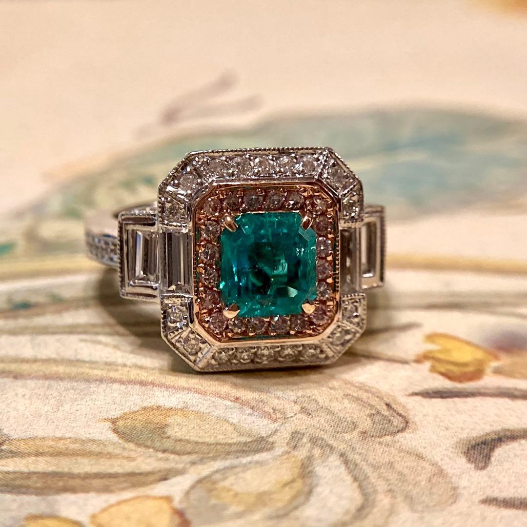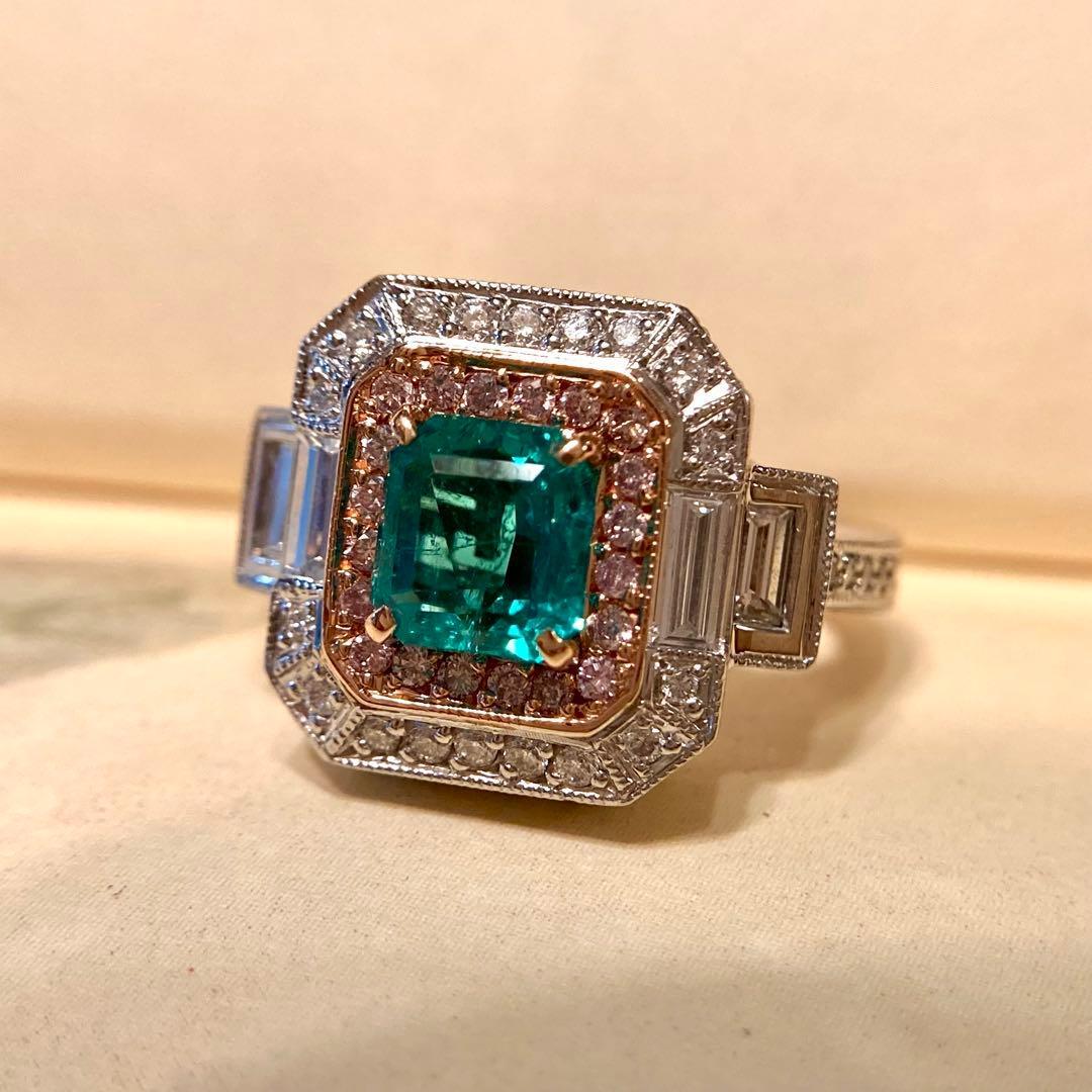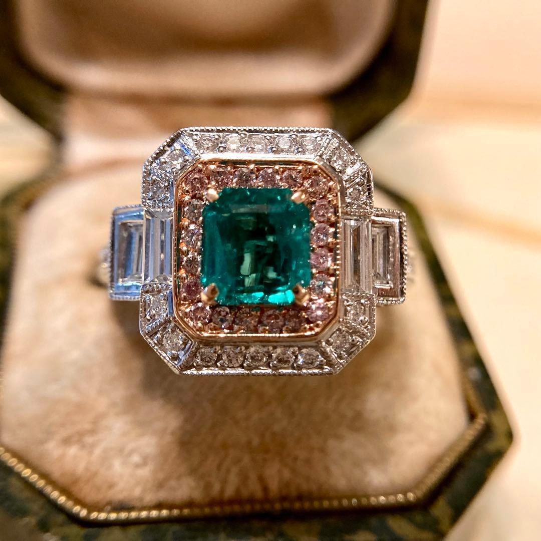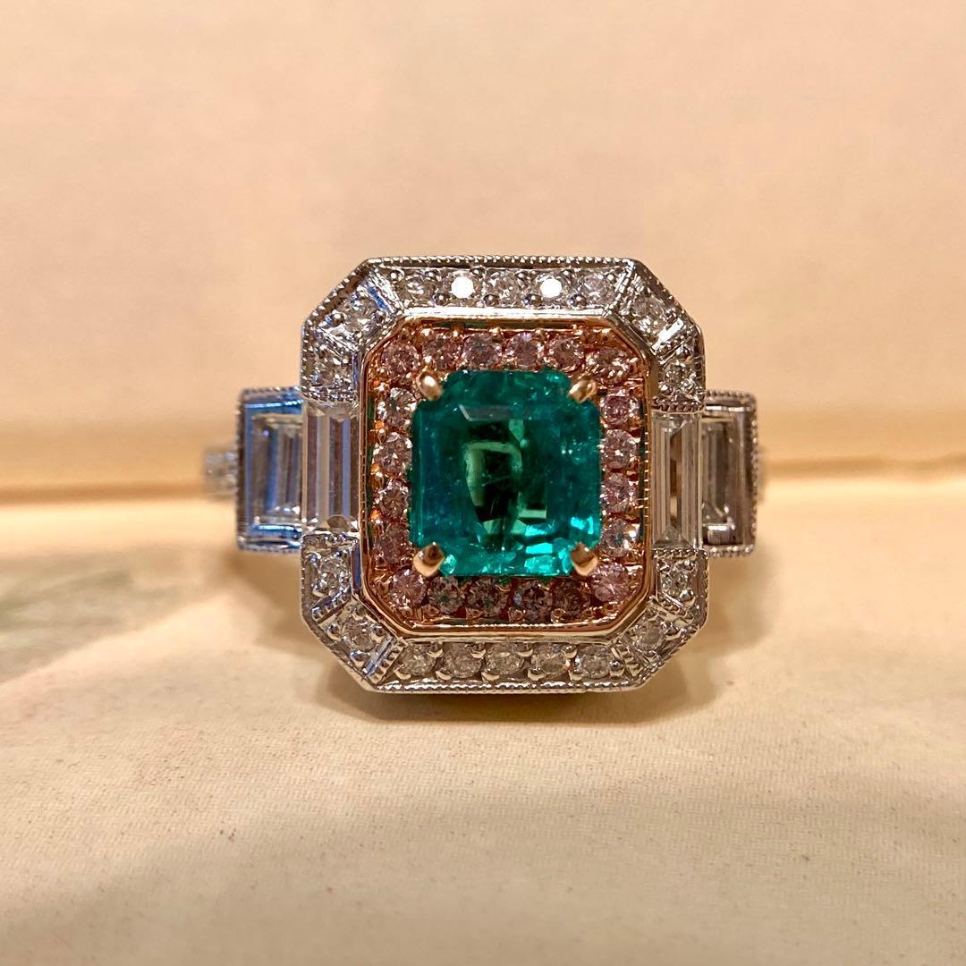 センターのエメラルドに寄り添うのは、可憐なピンクダイヤモンド。その外周をホワイトダイヤモンドが清らかに縁取り、サイドには整然と並ぶバゲットカットダイヤモンドが端正なラインを添えています。