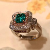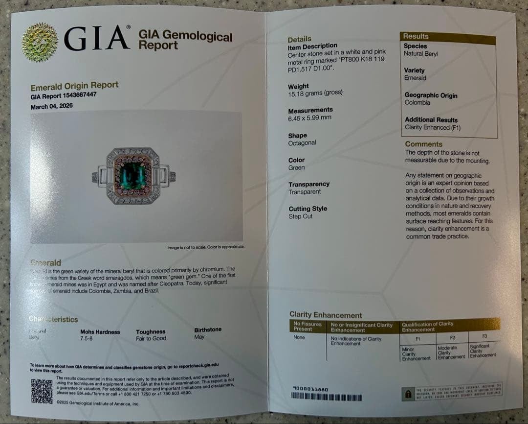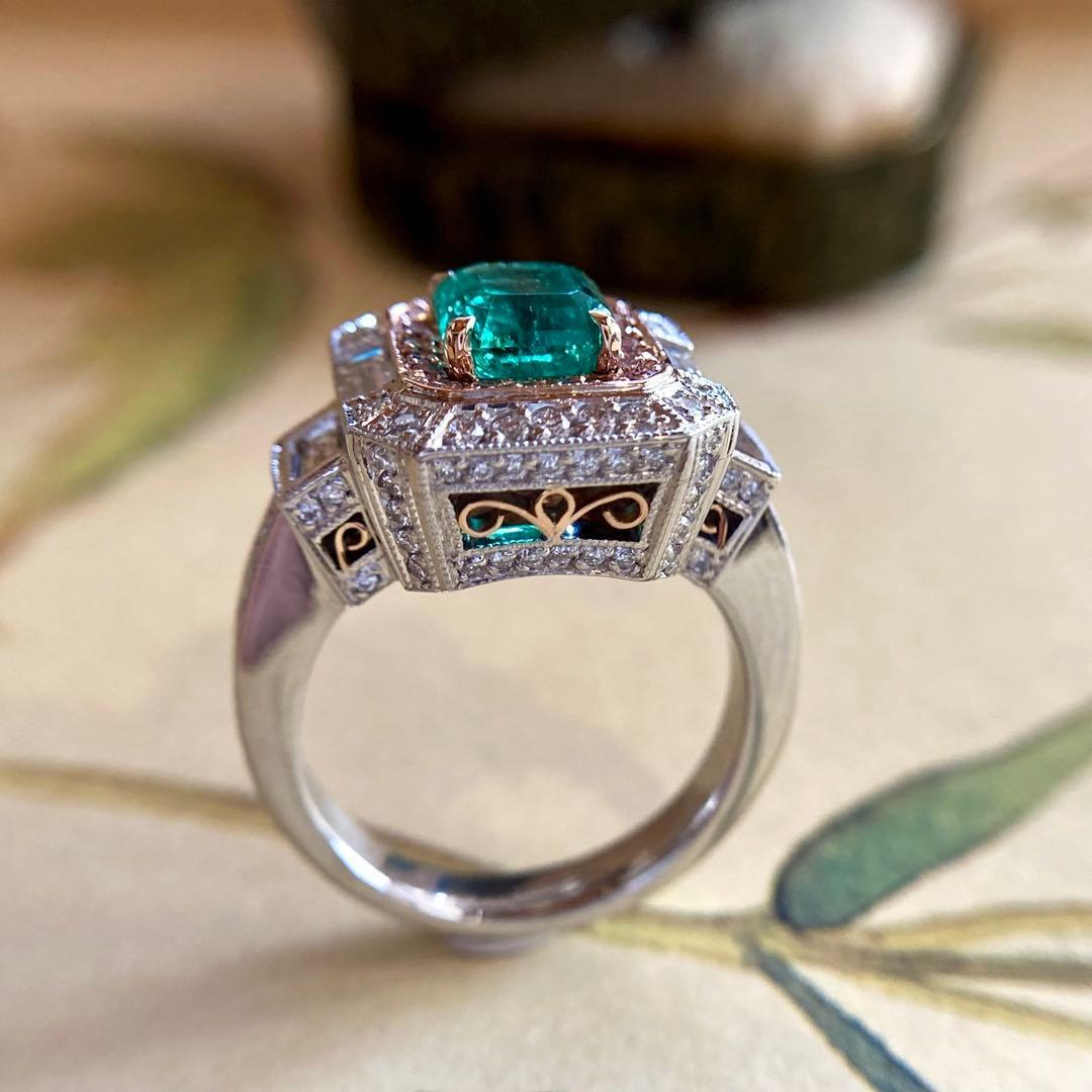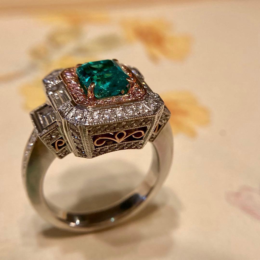 中央にあしらわれているエメラルドは、GIAにより世界最高峰の産地として知られるコロンビア産、そして人の手が加わっていることがごく僅かであることを示す「F1」であることが確認されています。