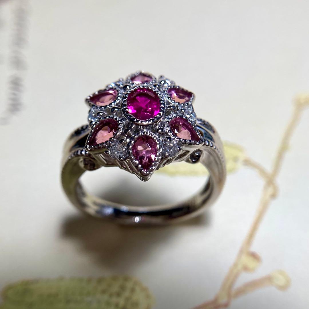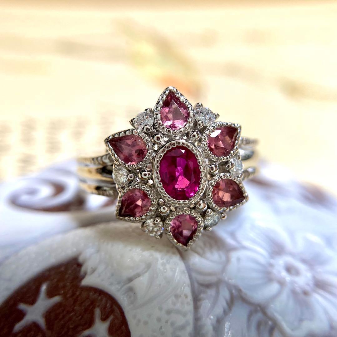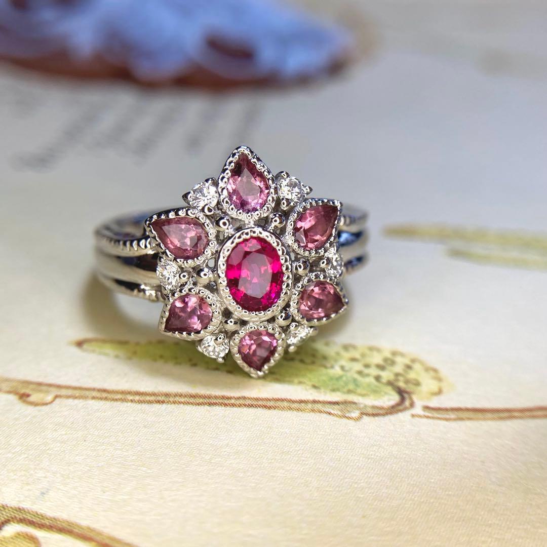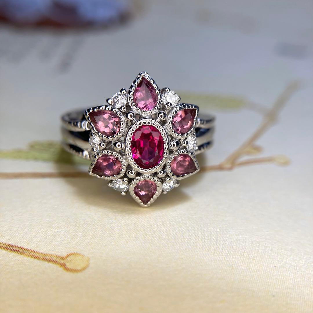 pt900 ビルマ産 ルビー トルマリン お花リング 指輪 ダイヤモンド