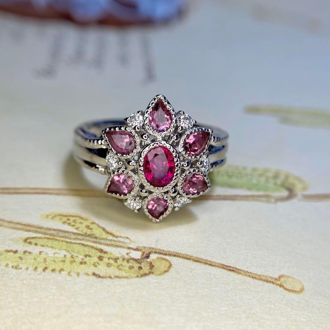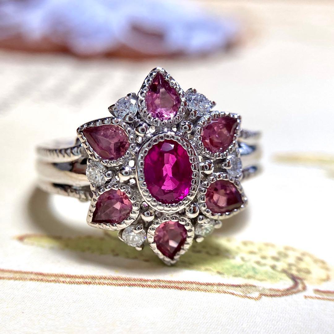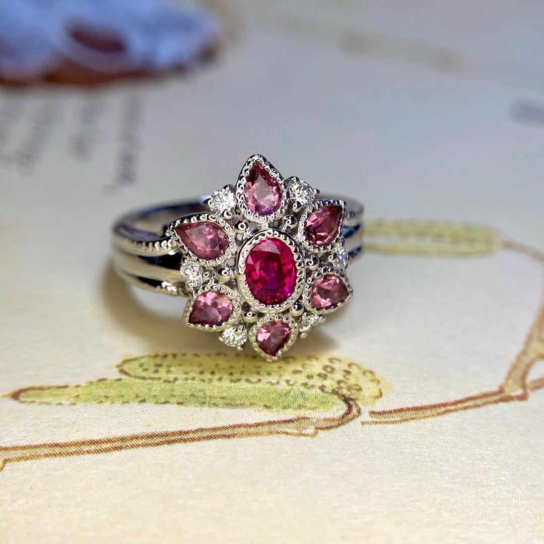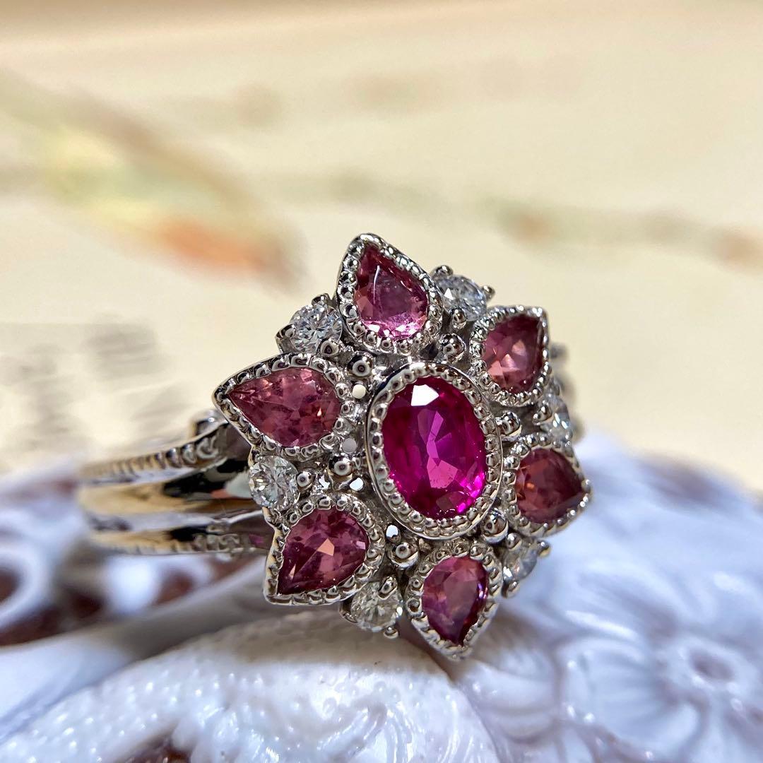 pt900 ビルマ産 ルビー トルマリン お花リング 指輪 ダイヤモンド