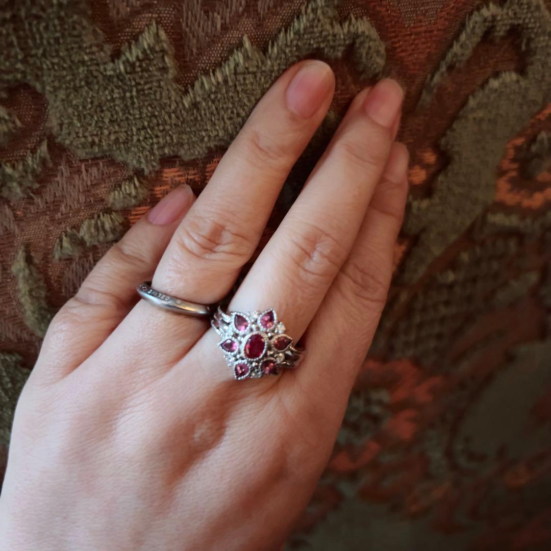 中央のルビーは、明るく華やかな赤が美しく、光を受けるたびに内側から湧き上がるような輝きを感じさせる存在感のある一石。