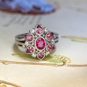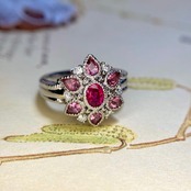 オーバルカットのルビーの周囲には、優しいピンクの色合いを持つトルマリンが花びらのように配されており、まるで一輪の花が指先に咲いたかのような華やかな佇まいを見せてくれます。