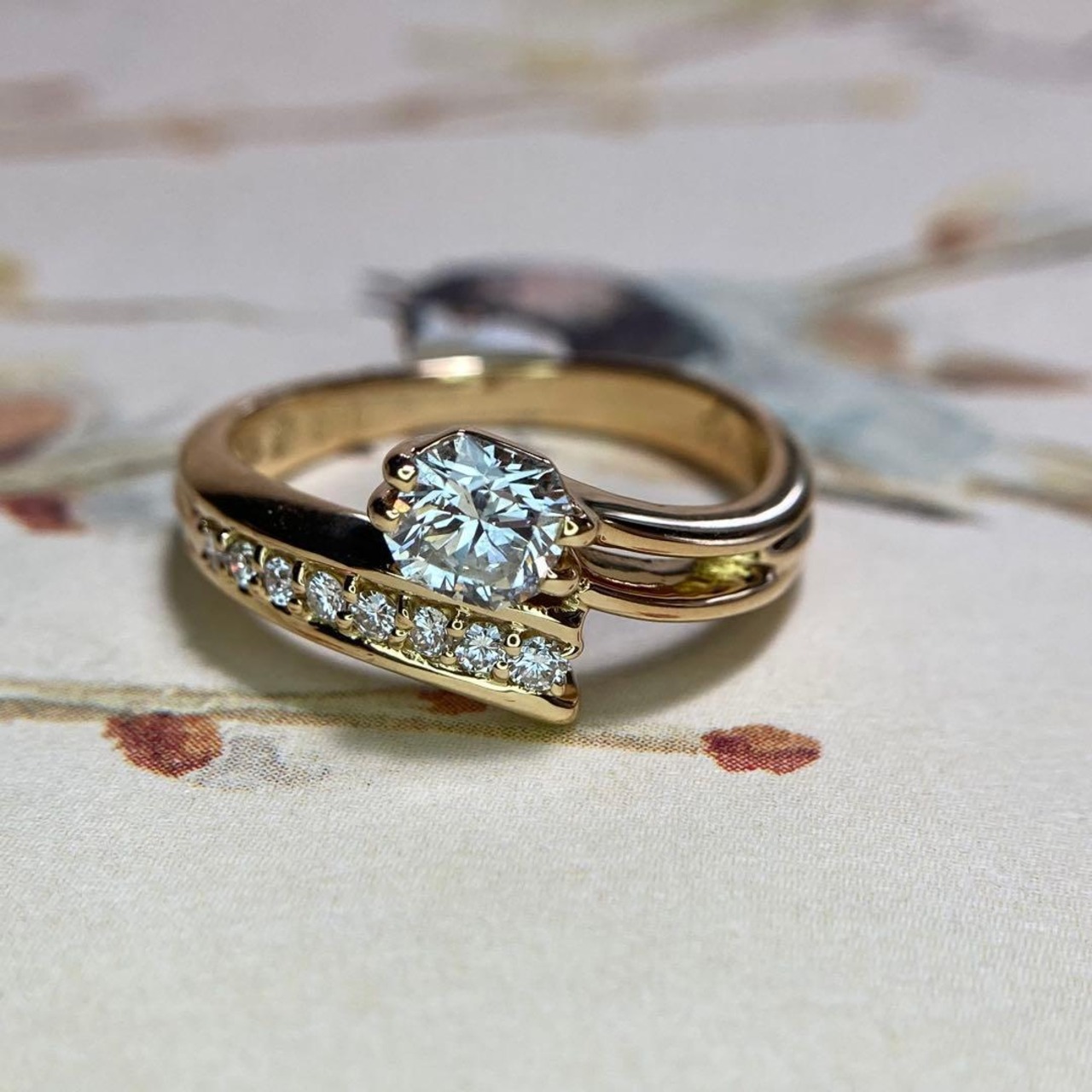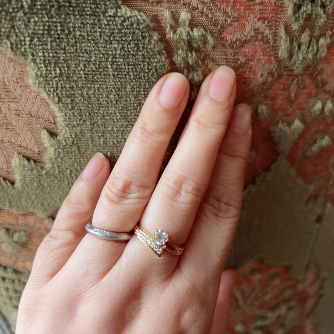片側には小さなダイヤモンドが丁寧に並べられ、中央のダイヤモンドの輝きを引き立てながら、指先にさりげない華やぎを添えています。