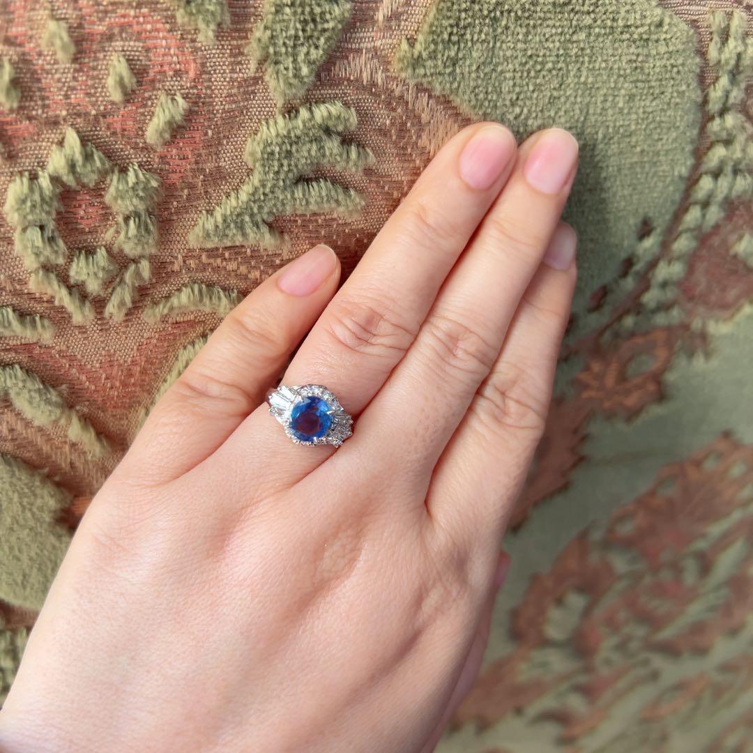 石の周囲にはダイヤモンドが丁寧に配され、中央のサファイアの深い青を引き立てるように輝きを添えています。