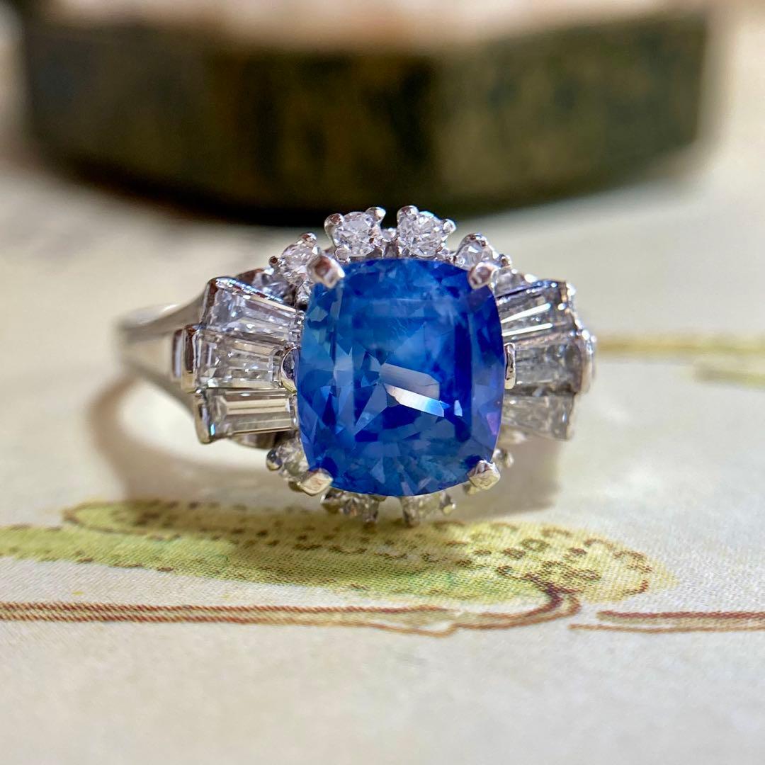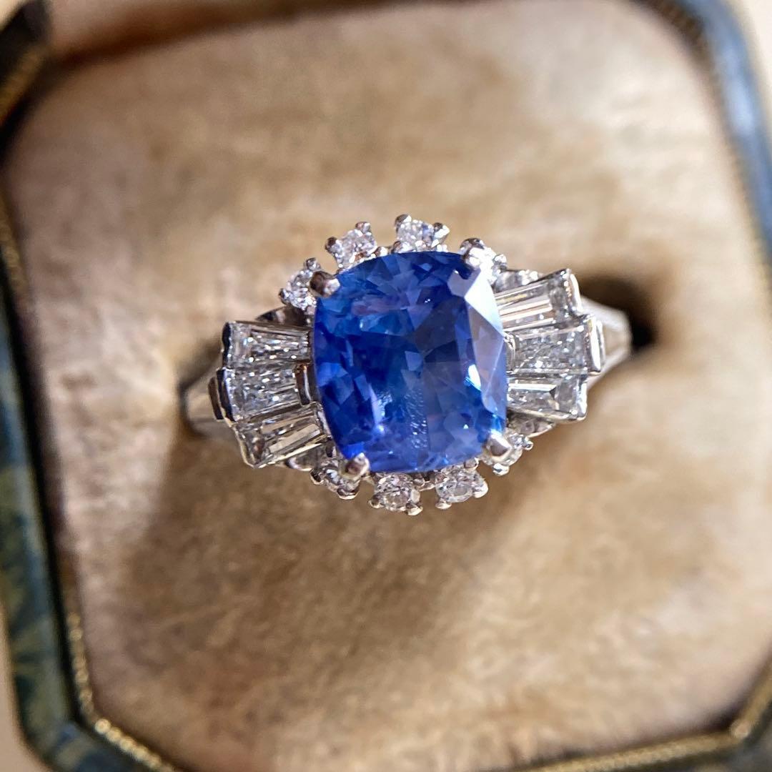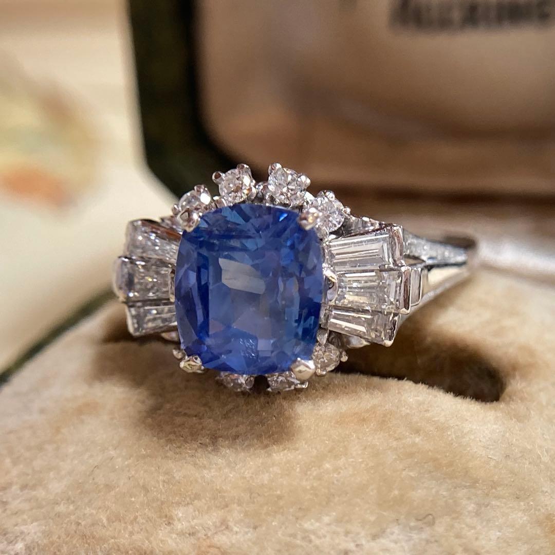 リングの両脇には、テーパーバゲットダイヤモンドとラウンドダイヤモンドが贅沢に配され、中央のサファイアを包み込むように構成された華やかなデザイン。