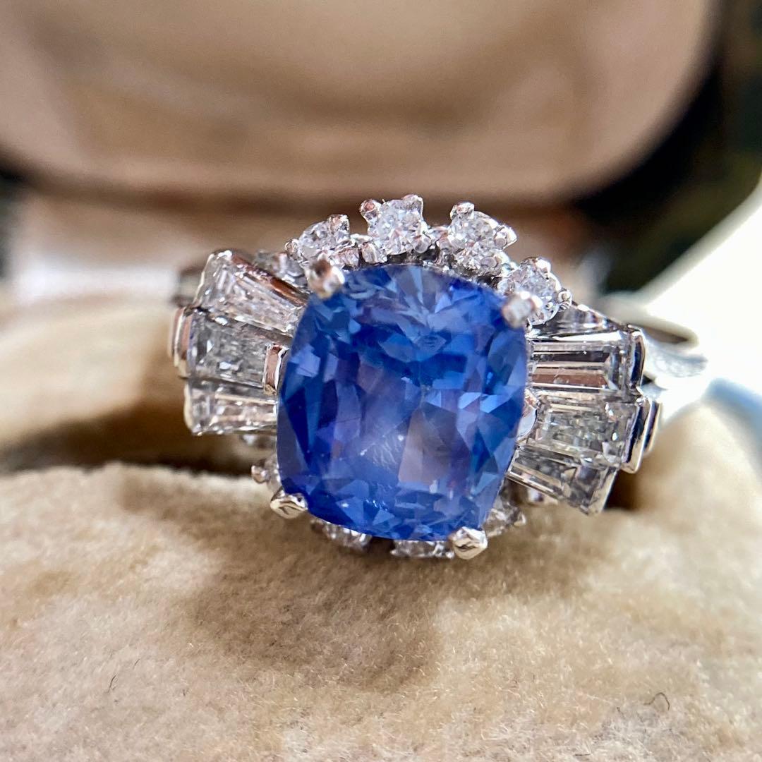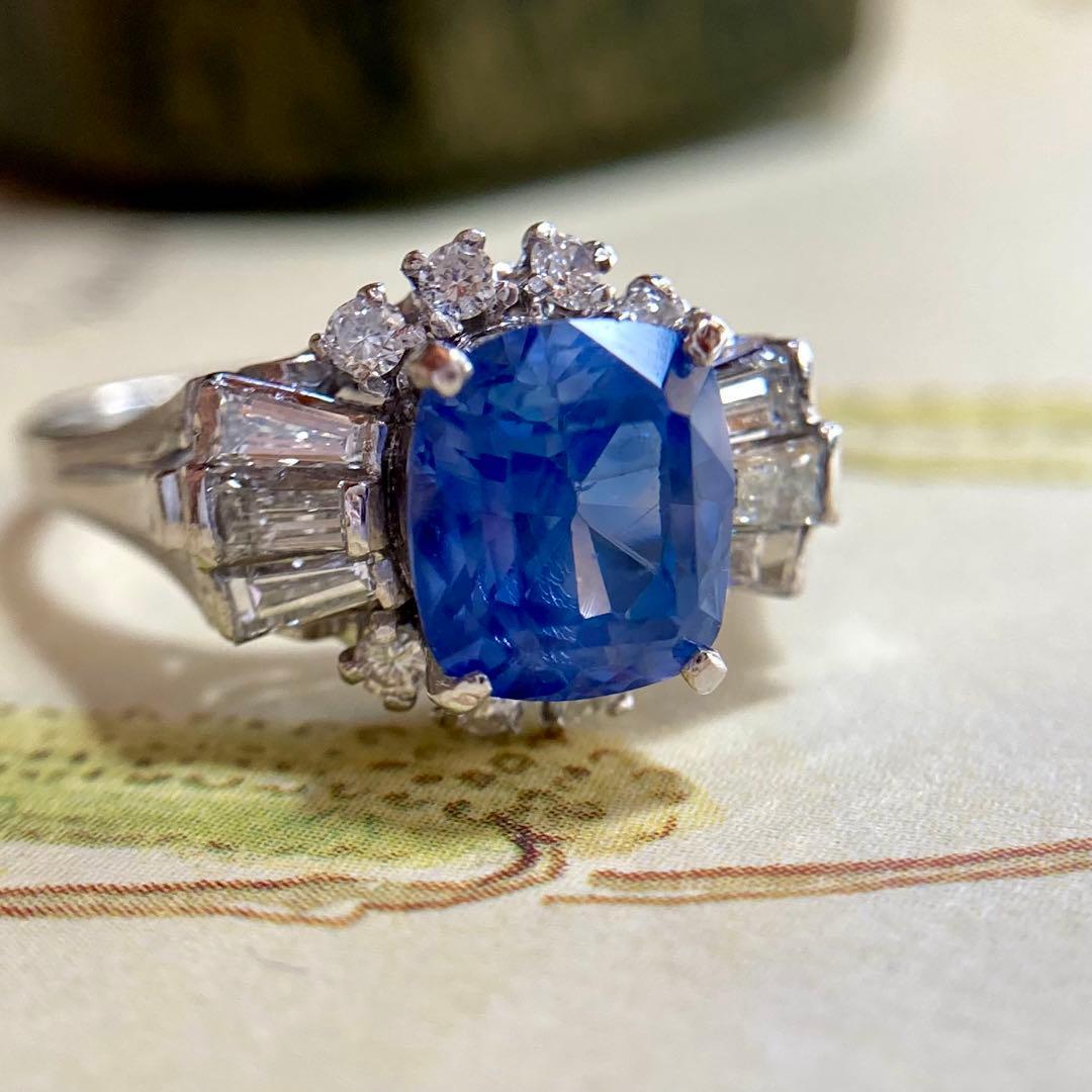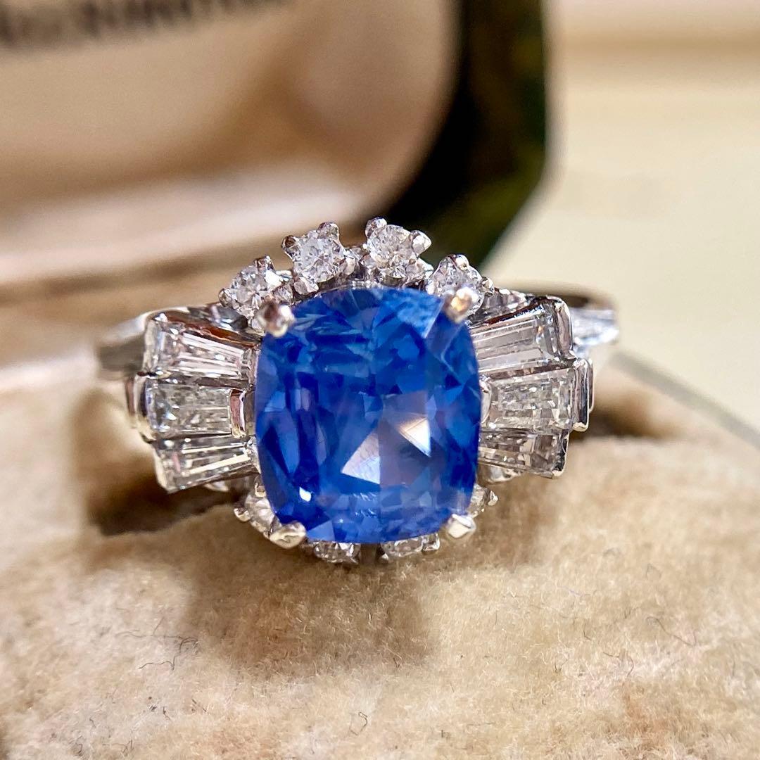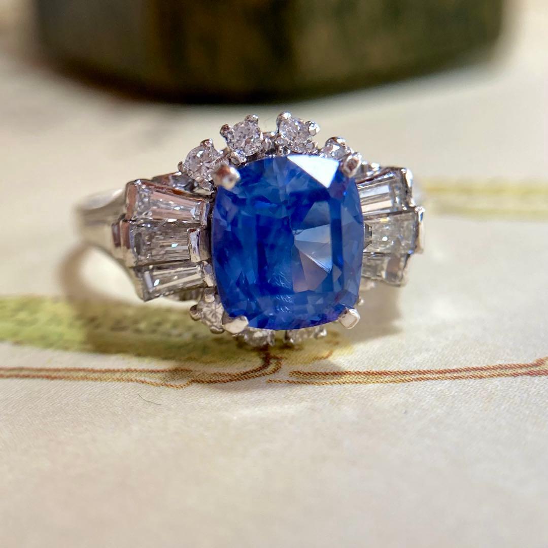 リングの両脇には、テーパーバゲットダイヤモンドとラウンドダイヤモンドが贅沢に配され、中央のサファイアを包み込むように構成された華やかなデザイン。