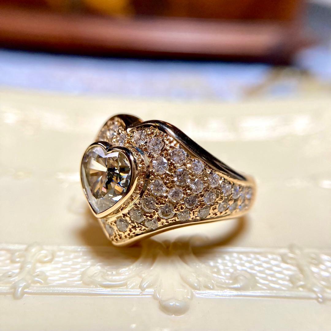 まず目を奪われるのは、中央に配された1.03ctのハートシェイプダイヤモンド。