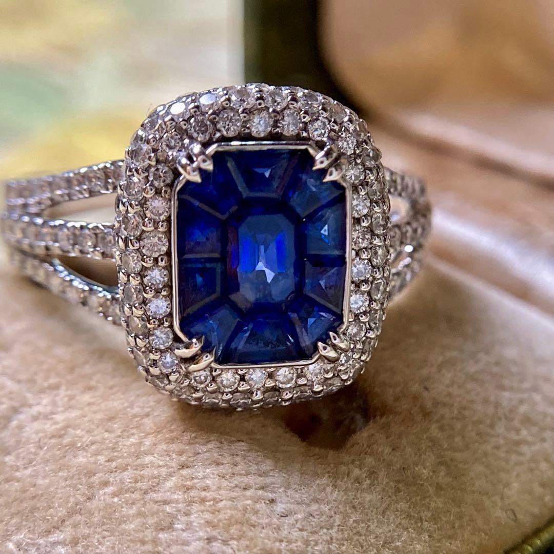 単一の大粒石ではなく、複数のサファイアを隙間なく組み上げる「カリブル・カット」技法により、一つの大きなエメラルドカットのような端正な面を形成。