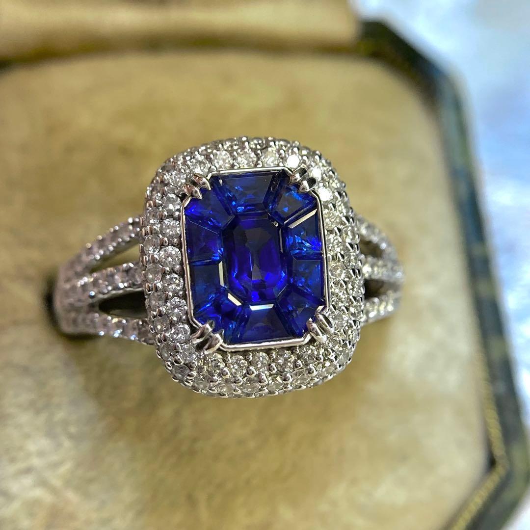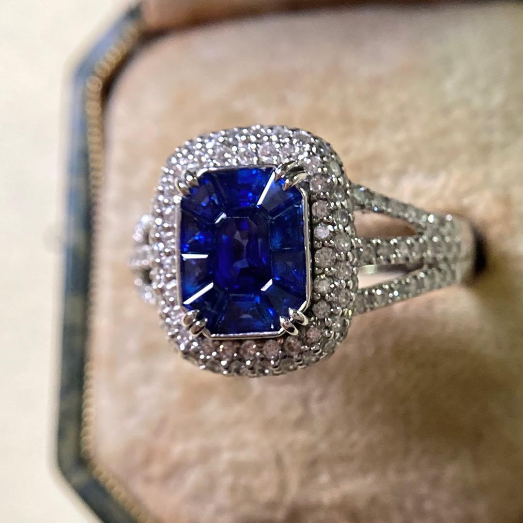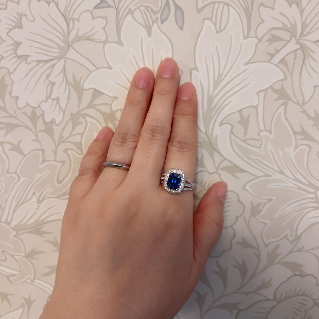 サファイアは濃厚でありながらも黒く沈むことなく、光を受けるたびに美しい青の表情を見せてくれるロイヤルブルーらしいお色味。