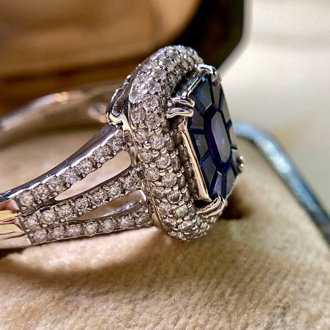 周囲には繊細なダイヤモンドのパヴェセッティングが幾重にも施され、3列に分かれたスプリットシャンクと相まって豊かな立体感を演出。中央の深いブルーを一層際立たせ、指元に華やぎと奥行きをもたらします。