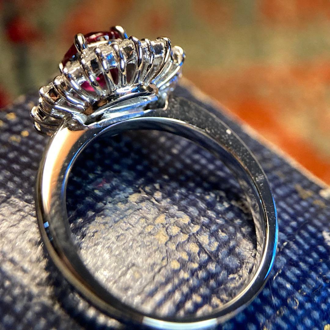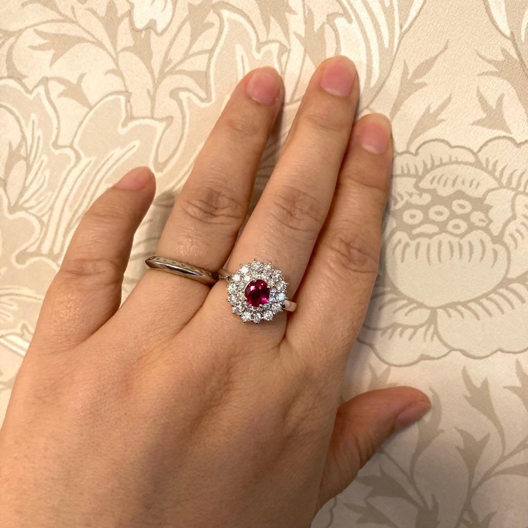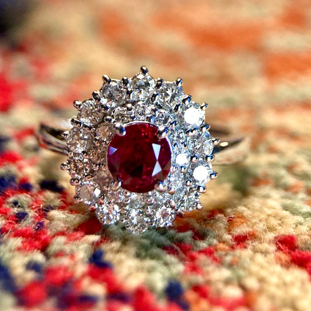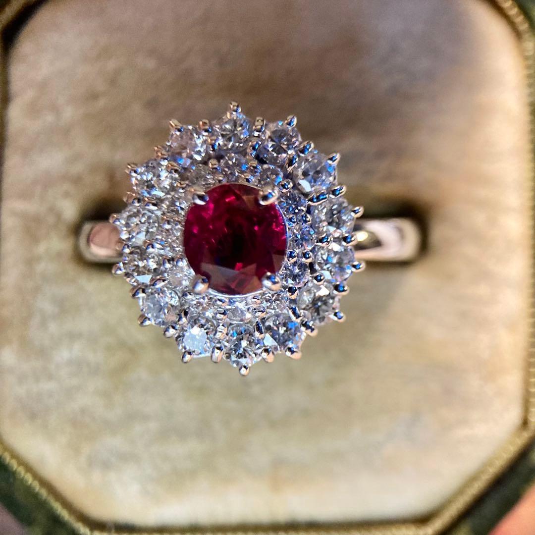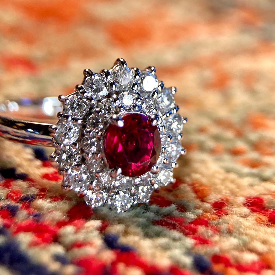 内側には繊細なサイズのダイヤモンドを、外側には一回り大きなダイヤモンドをあしらうことで、奥行きと立体感のある輝きを生み出しています、贅沢なボリュームでありながら、決して過剰に主張することなく、あくまで主石であるルビーの美しさを引き立てるために計算された絶妙なバランスに仕上がっています。