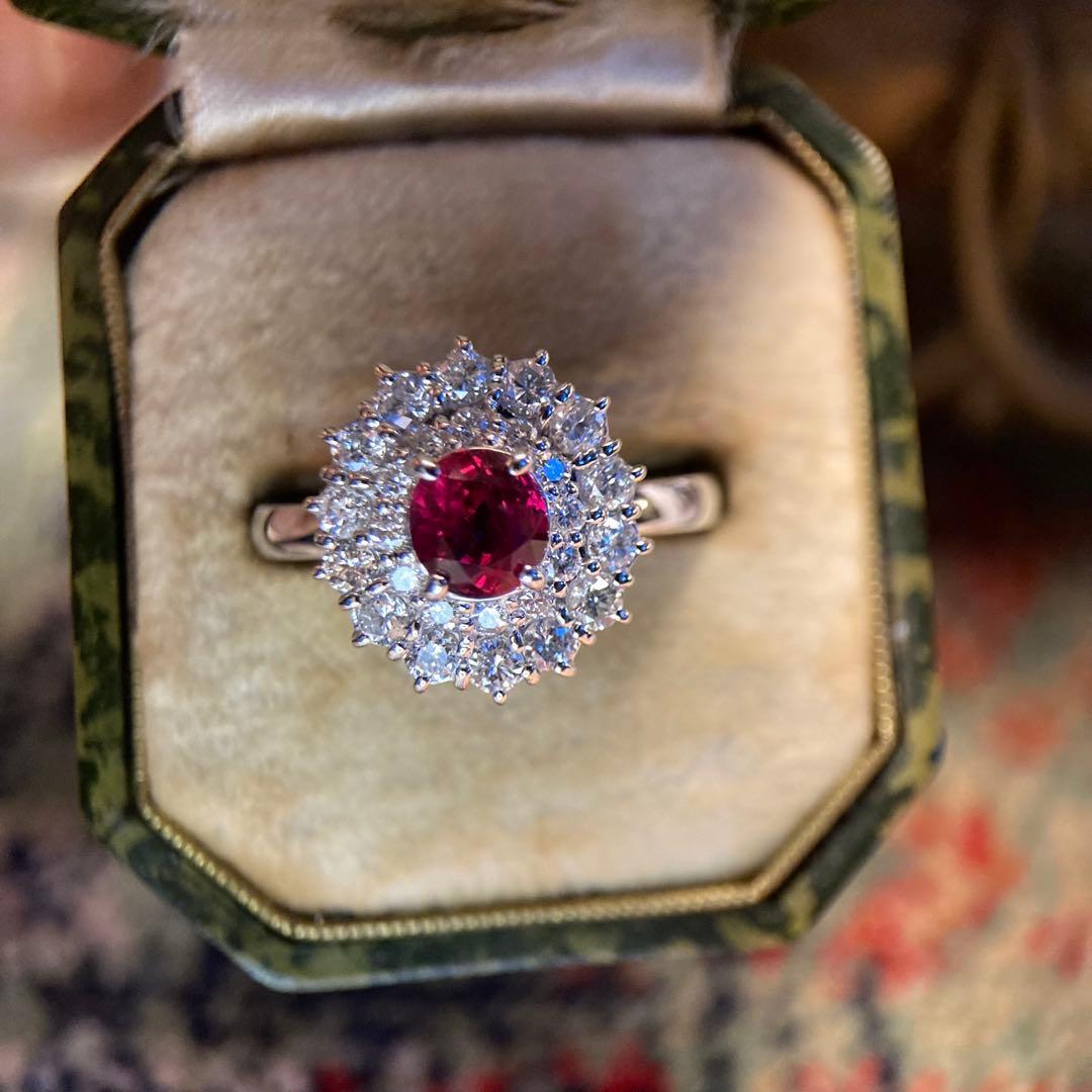 その周囲を取り巻くダイヤモンドは、ルビーを中心に二重に配された意匠。