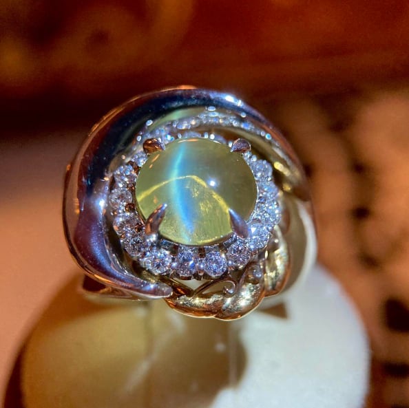 台座も大変素晴らしく、キャッツアイの周りにはネックレスのようにダイヤモンドが一周しており、またその上に艶やかなプラチナがベールのように飾られ、まるでドレスを纏った貴婦人のような雰囲気を醸し出しています。